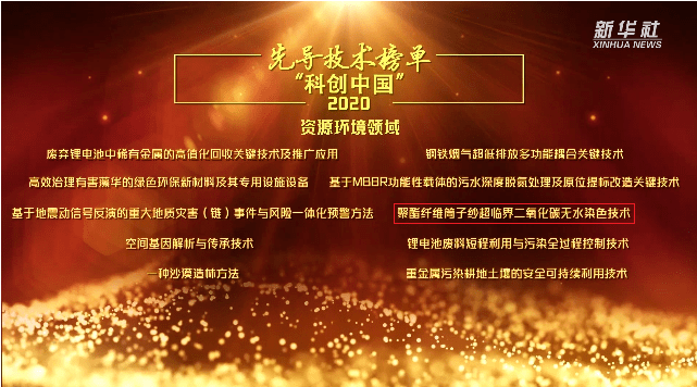 青岛即发集团股份有限公司的“聚酯纤维筒子纱超临界二氧化碳无水染色技术”系统地研究了超临界二氧化碳无水染色技术产业化工艺、装备、染料以及关键部件,开发了二氧化碳分离回收再利用、染料溶解控制等系统,解决了装备正常运行、染料结块等关键的技术难题,建设了拥有自主知识产权且连续正常运行的超临界二氧化碳无水染色小试和中试示范线,产品各项指标均达到同类产品国家相关标准要求。该技术解决了全纺织行业染色高耗水和高污水排放难题,对我国纺织工业转型升级和生态文明建设具有重要意义。