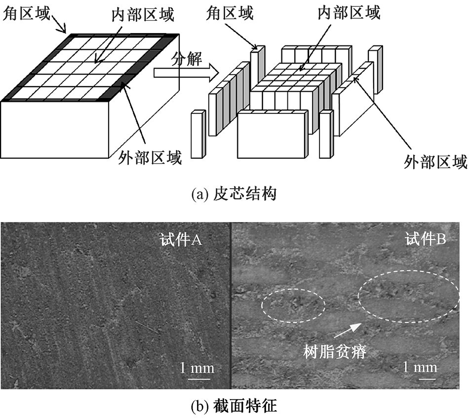 Skin-core structure (a) and cross-section features (b) of composite specimens"