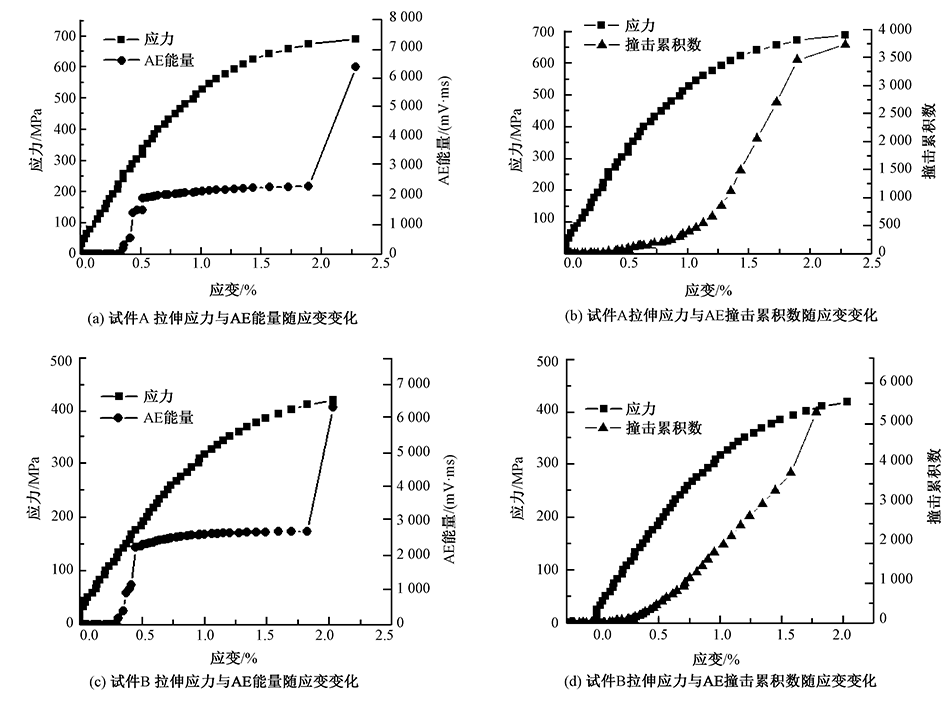 Changes of tensile stress, AE energy and accumulative hits of composite specimens with strain. (a) Stress, AE energy changes with strain of specimen A; (b) Stress, AE accumulative hits changes with strain of specimen A; (c) Stress,AE energy changes with strain of specimen B; (d) Stress, AE accumulative hits changes with strain of specimen B"