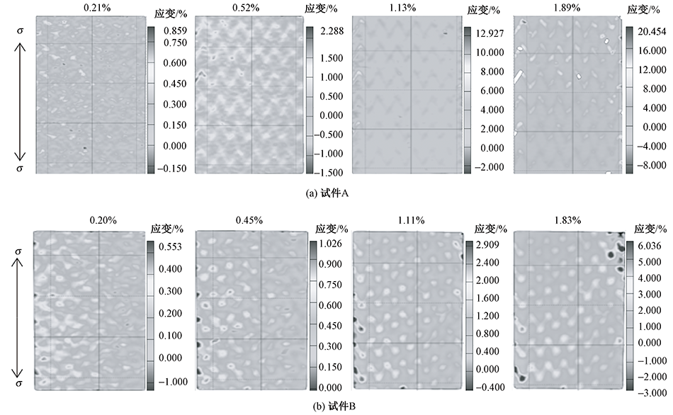 Surfacial strain fields of composites at different average strain levels. (a) Specimen A; (b) Specimen B"