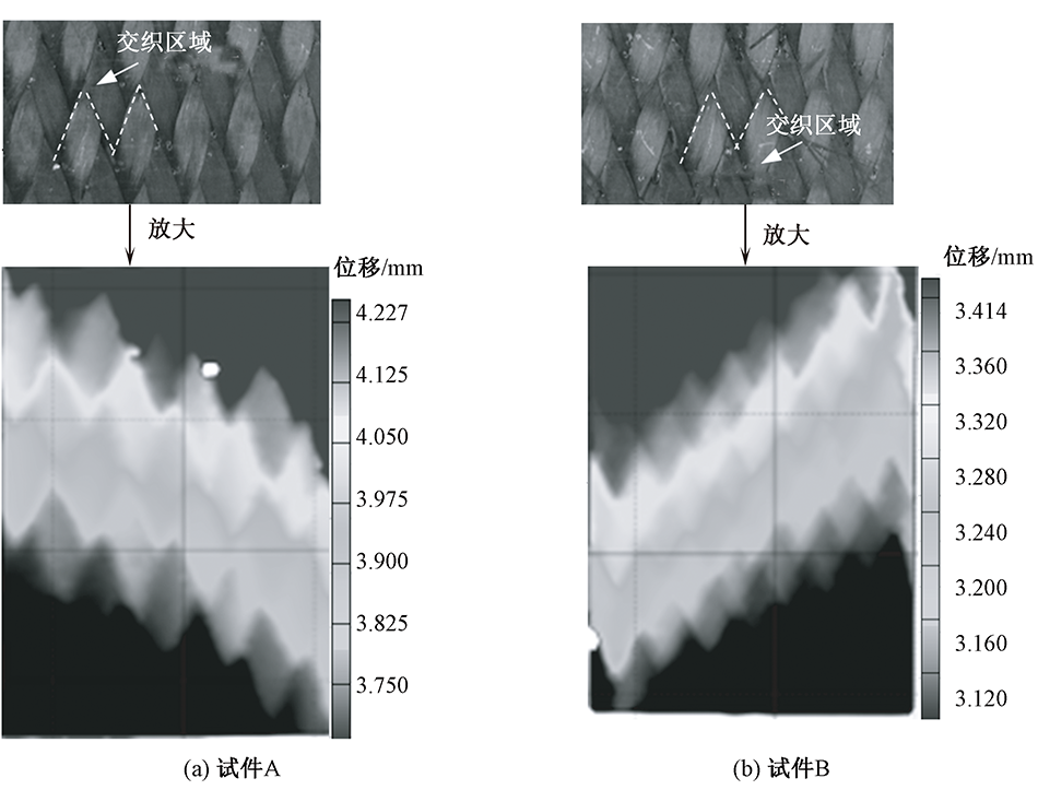 Local morphology and critical failure status of composite material for surface displacement field. (a) Specimen A; (b) Specimen B"