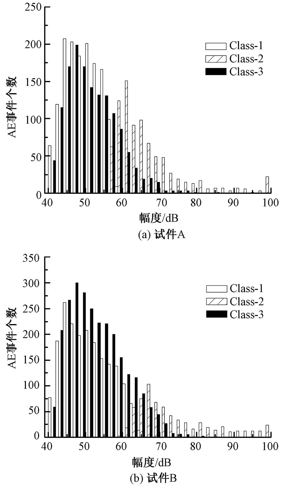 Distribution of AE amplitude of clustering. (a) Specimen A; (b) Specimen B"