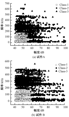 Distributions of AE amplitude and frequency of clustering. (a) Specimen A; (b) Specimen B"