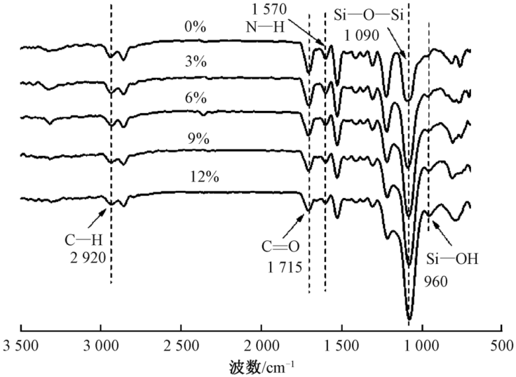 FT-IR spectra of PU/SiO2 composite membranes prepared with different mass fraction of SiO2"