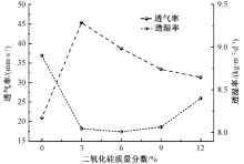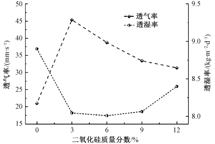 Air permeability and WWVT of PU/SiO2 composite membranes prepared with different mass fraction of SiO2"
