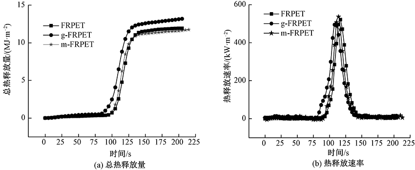 Cone calorimetry curves of pristine and modified flame retardant polyester fabric. (a) Total heat release;(b) Heat release rate"