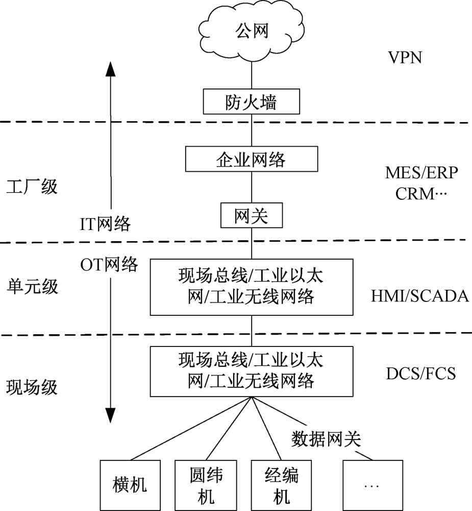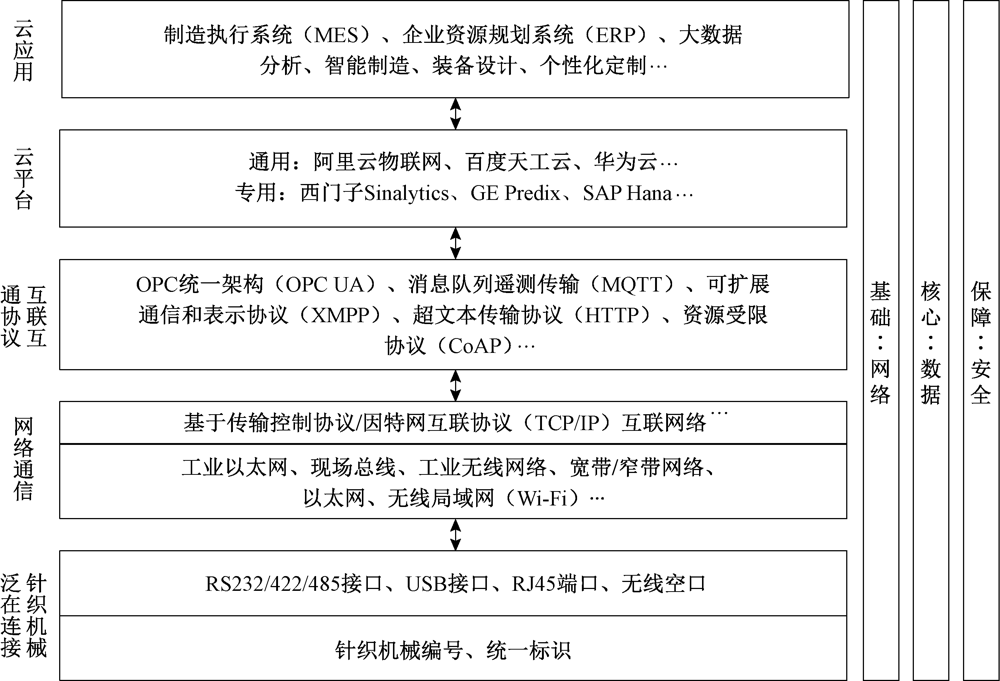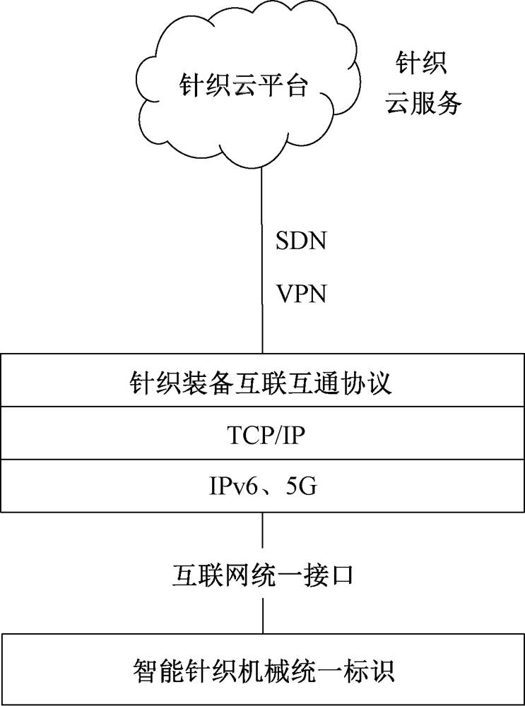 In order to realize the interconnection and intercommunication of knitting machine from the bottom layer to the cloud, under the drive of the national intelligent manufacturing standard system, based on the network, data, security and other factors, the internet model of knitting machine industry was constructed, and the ubiquitous connection and logo of knitting machine was discussed. By analyzing the characteristics of OT+IT network, the network structure and bandwidth based on ″internet +″ are designed, and the future network is discussed. Combining the reliability of heavyweight communication protocol and the convenience of lightweight communication protocol, a special protocol for knitting machine interconnection is designed. The structure and semantics of the message are standardized. The communication guarantee and service quality assurance mechanism are established to make the message. Be sure to be reachable. The verification platform for the interconnection and intercommunication of the knitting machine industry was designed. The terms of the industrial internet interconnection network and communication protocol of knitting machines such as flat knitting machines, circular knitting machines and warp knitting machines are verified, and the verification, revision and re-verification processes are guaranteed.