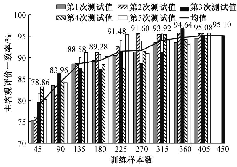 In order to improve the consistency between subjective and objective ratings for the repeatedly laundered fabrics, an automatic method of wrinkling assessment based on visual feature coding and multi-classification support vector machine (SVM) was proposed. 450 representative wrinkled fabric images including 6 standard samples were selected as the training set. In addition, the human visual focusing mechanism was simulated, and the sparse coding method was utilized to extract the feature vector chain codes from 9 half-level image sub-databases. 200 wrinkled images as testing samples in this experiment were classified by linear multi-classification SVM. Results show that consistency between subjective and objective rating reaches 95.1%, rating precision is 0.1 and rating speed for single sample is less than 6 seconds, which meet the current commercial rating requirement for effective evaluations of fabric finishing, detergent products and care equipment.