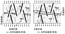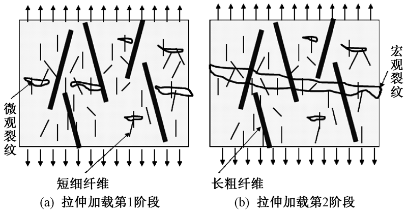 Tensile failure of hybrid fiber reinforced concrete with different size under tension. (a) First stage of tensile loading; (b) Second stage of tensile loading"