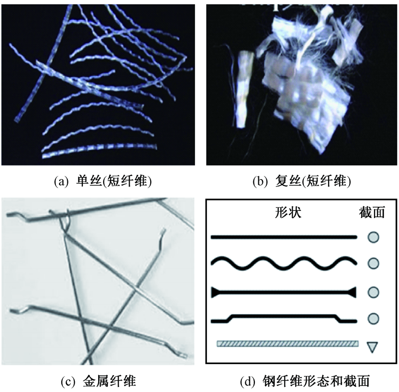 Types and shapes feature of fibers used to reinforced concrete. (a) Short mono-fiber; (b) Short multi-fiber; (c) Steel fiber; (d) Shape and cross-section of steel fiber"