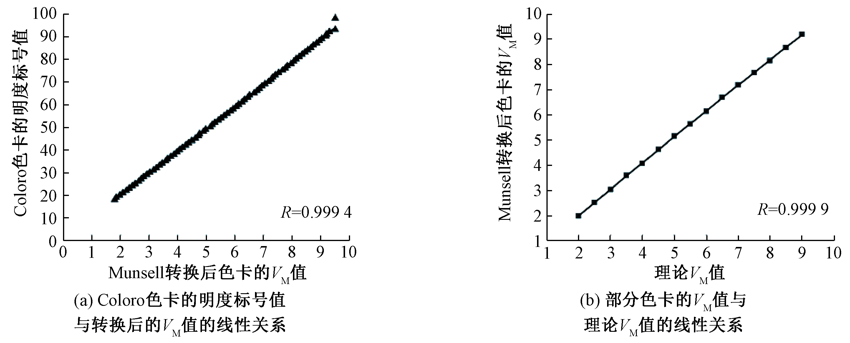 Relationship between lightness label value of Coloro color system and VM. (a)Linear relationship between lightness label value of Coloro color card and converted VM; (b)Linear relationship between the VM of some cards and their theoretical VM"