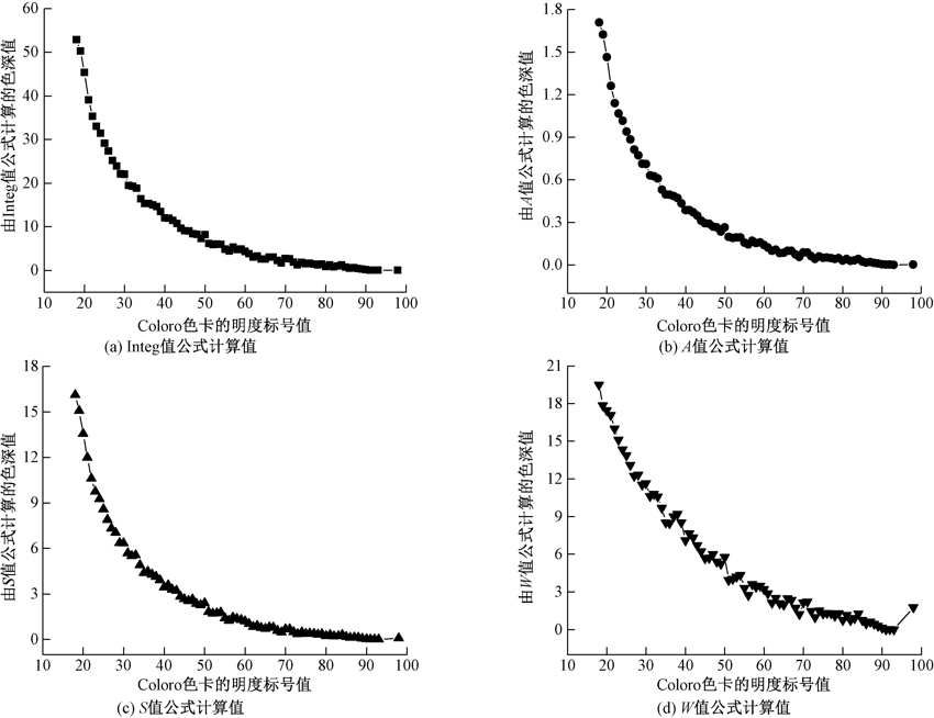 Curves of color depth value calculated by 4 formulas as a function of Coloro lightness label value. (a)Integ value formula;(b)A value formula;(c)S value formula;(d)W value formula"