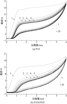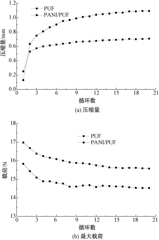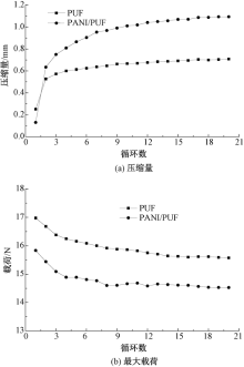 Compression (a) and maximum load (b) of PUF and PANI/PUF in different cycle"