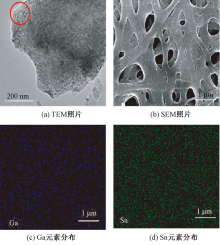 TEM and SEM images of GaSn/C nanofiber films. (a) TEM image; (b) SEM image; (c) Ga distribution;(d)Sn distribution"