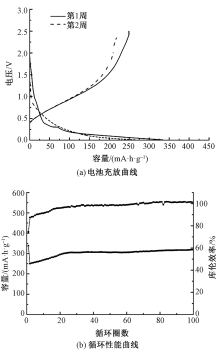 Electrochemical performance curve of GaSn/C battery. (a) Charge and discharge curve; (b) Cycle performance"