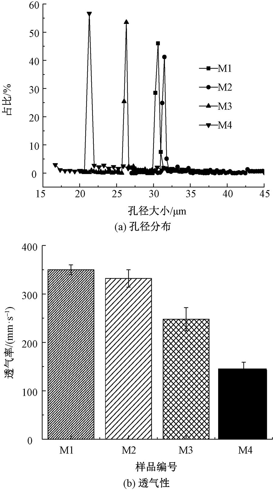 Pore size distribution (a) and air permeability (b) of PTFE/PPS/ANF needle-punched composite felt with different ANFs mass fractions"