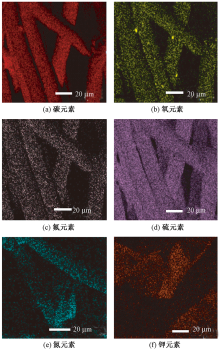 Element distribution of needle felt before and after treatment with aramid nanofibers dispersion. (a)Carbon;(b)Oxygen;(c)Fluorine;(d)Sulfur; (e)Nitrogen;(f)Potassium"