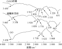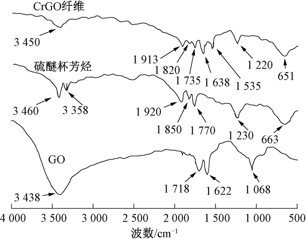 FT-IR spectra of GO, thioether calixarene and CrGO fibers"
