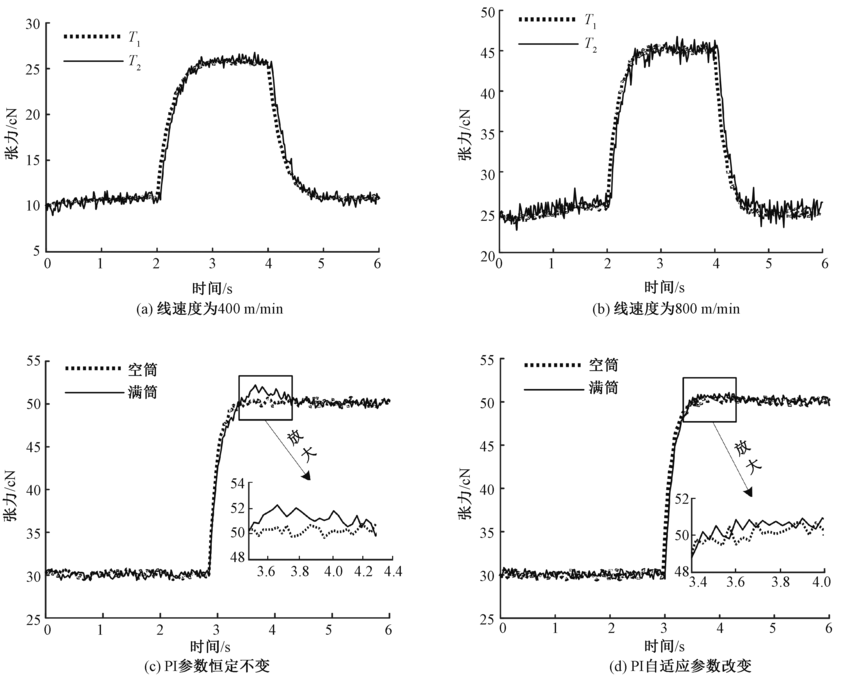 Experimental test waveforms. (a)Linear velocity with 400 m/min;(b) Linear velocity with 800 m/min: (c) Constant PI parameter;(d) Changble PI adaptive parameter"