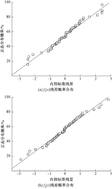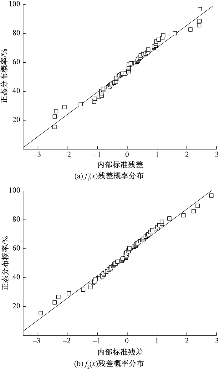 Model fitting performance analysis. (a) Residual probability distribution of f1(x);(b) Residual probability distribution of f2(x)"