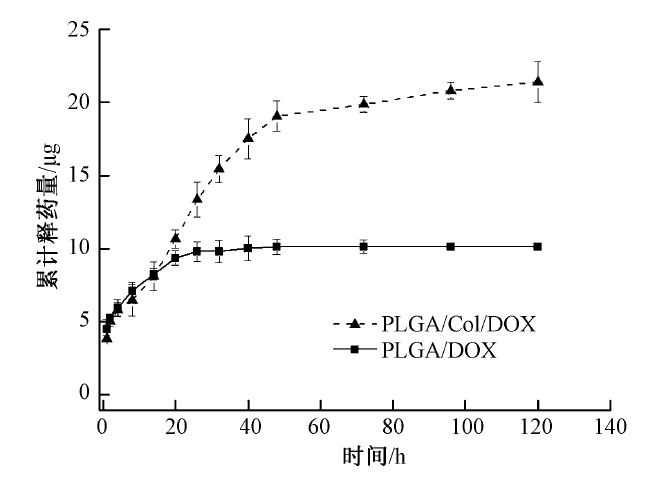 Drug release curve of PLGA/DOX and PLGA/Col/DOX nanofiber membranes"