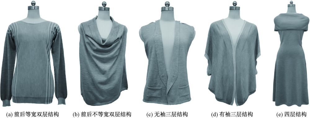 Physical pictures of fully formed garments with different structures. (a) Double-layer structure with equal width in front and back pieces;(b) Double-layer structure with unequal width in front and back pieces;(c) Three-layer structure without sleeves; (d) Three-layer structure with sleeves; (e) Four-layer structure"