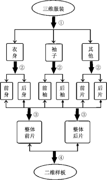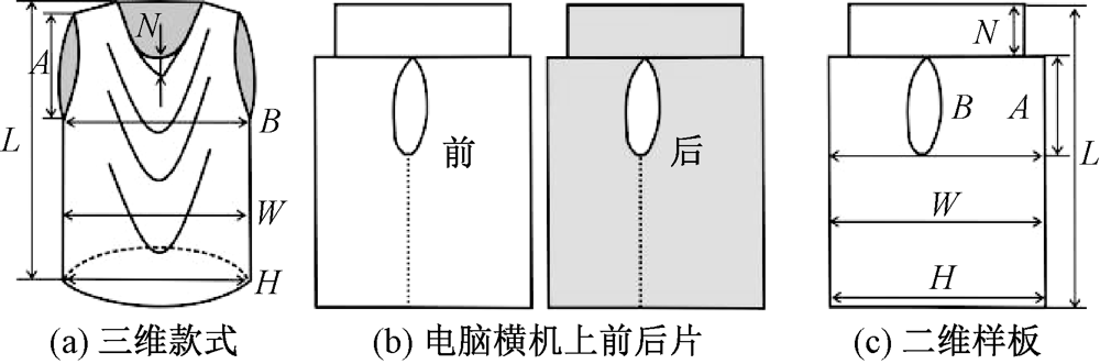 Sketch of converting 3-D style to 2-D pattern. (a) 3-D style; (b) Front and back pieces on flat machine; (c) 2-D pattern"