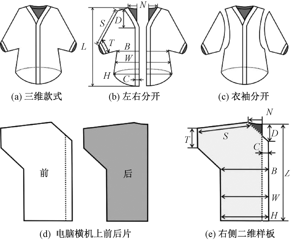 Conversion process from 3-D style with sleeves to 2-D pattern. (a) 3-D style; (b) Separate left and right;(c) Separate body and sleeves; (d) Front and back pieces on flat machine; (e) 2-D pattern of right"