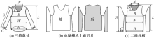 Conversion process from 3-D style with four-layer structure to 2-D pattern. (a) 3-D style; (b) Front piece and back piece on flat machine; (c) 2-D pattern"