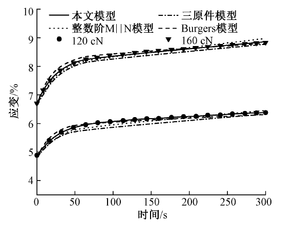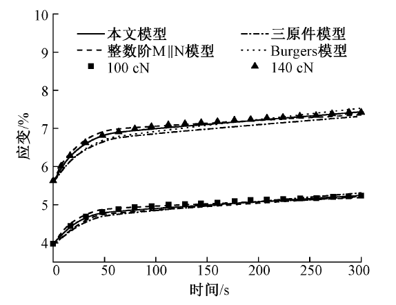 Aiming of the inaccuracy in existing yarn stretch mechanics models, the yarn extension behavior is analyzed by the fractional calculus model. The fractional order calculus theory with improved glue-pot model is introduced for the establishment of the fractional order yarn creep model. XL-2 tensile tester was used to measure the yarn elongation for creep with yarns under the same tension and of different linear density and with yarns under different tensions but of the same linear density, obtaining the creep curve for the whole process. The yarn creep test curves for yarns with different linear densities were selected for regression, and the model parameters were obtained. The relationship between creep model parameters and applied tension was also obtained. Finally, different models were used to fit and predict the yarn creep curve under different tension. The results show that the fractional order yarn creep model proposed in this paper is not only simple in structure and involving less parameters than the three-component model, integer order model and Burgers model, but also has high precision in the fit and prediction of yarn creep.