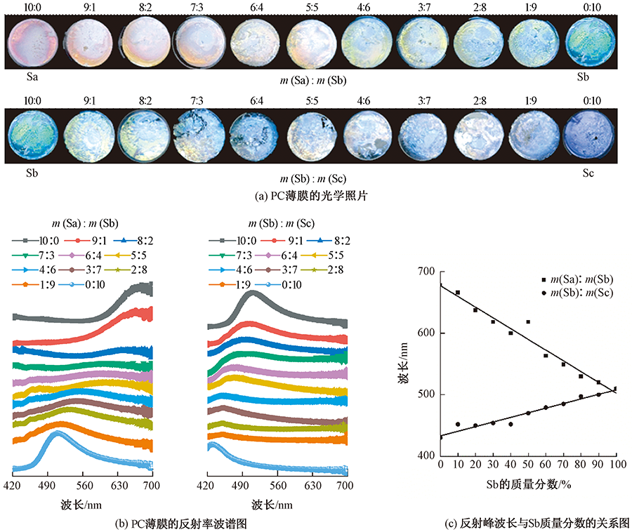 Optical photos (a) and spectral reflections (b) of PC films and relationship between Sb content and reflection peak wavelength(c)"