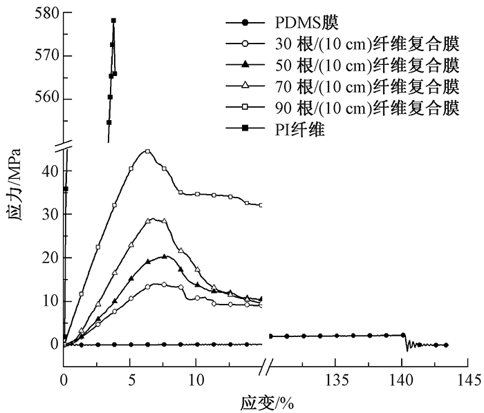 Stress-strain curve of PI fiber, PDMS film and PI fiber-reinforced films with different layer densities"