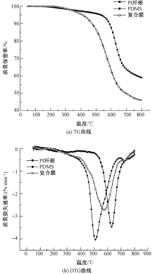 Thermal stability of PI fiber, PDMS and reinforced films. (a) TG curve; (b) DTG curve"