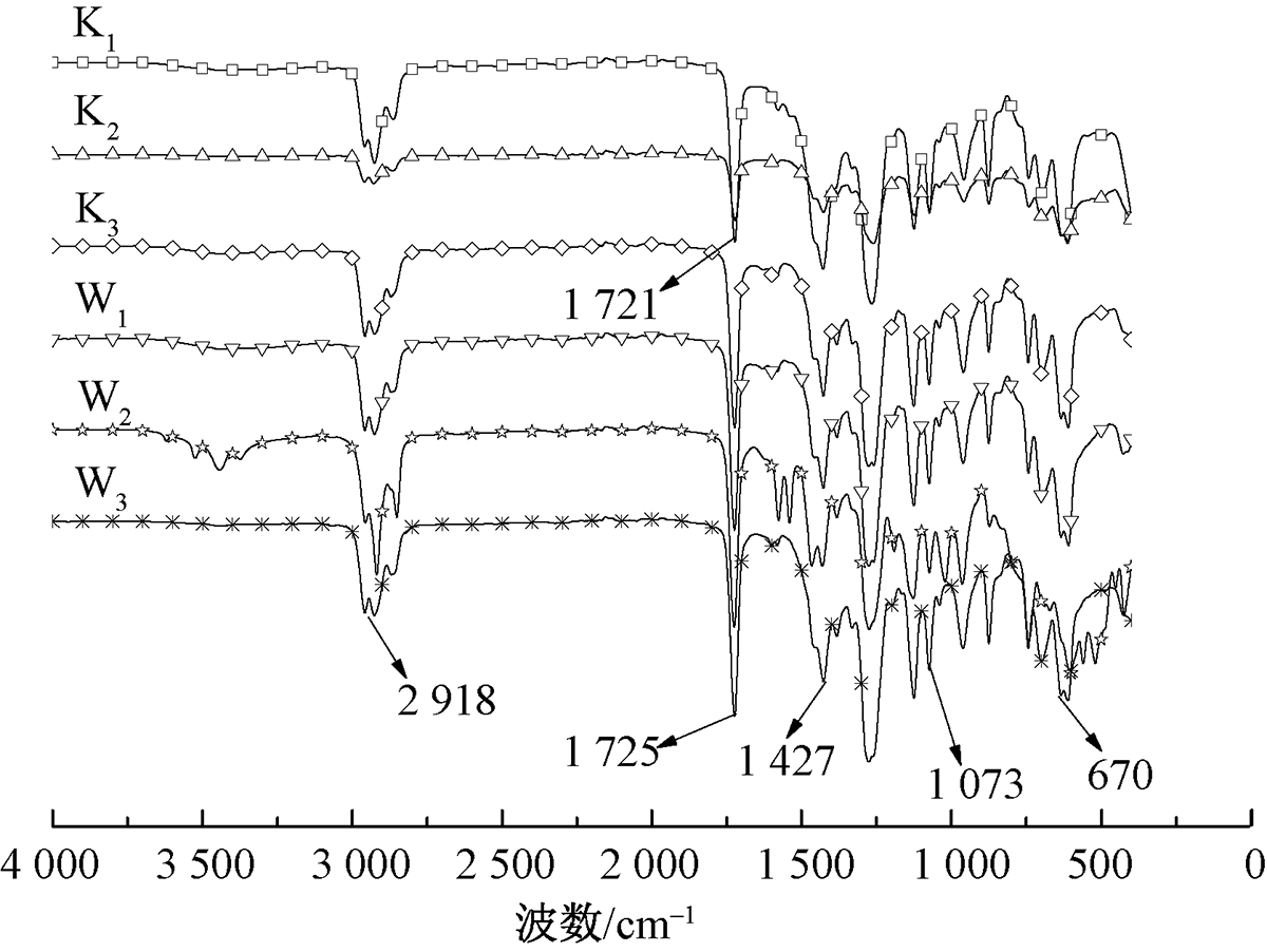 Infrared spectra of 6 samples after 1 000 h photo-oxygen aging treatment"
