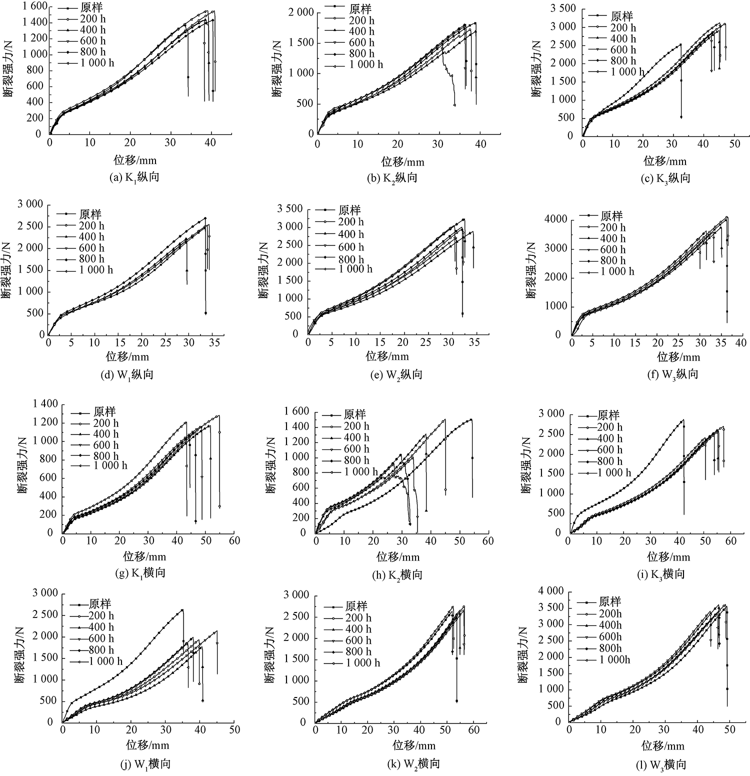 Stress-strain curves of longitudinal of K1(a), K2(b), K3(c), W1(d), W2(e) and W3(f) and transverse of K1(g), K2(h), K3(i), W1(j), W2(k) and W3(l) before and after photo-oxygen aging"