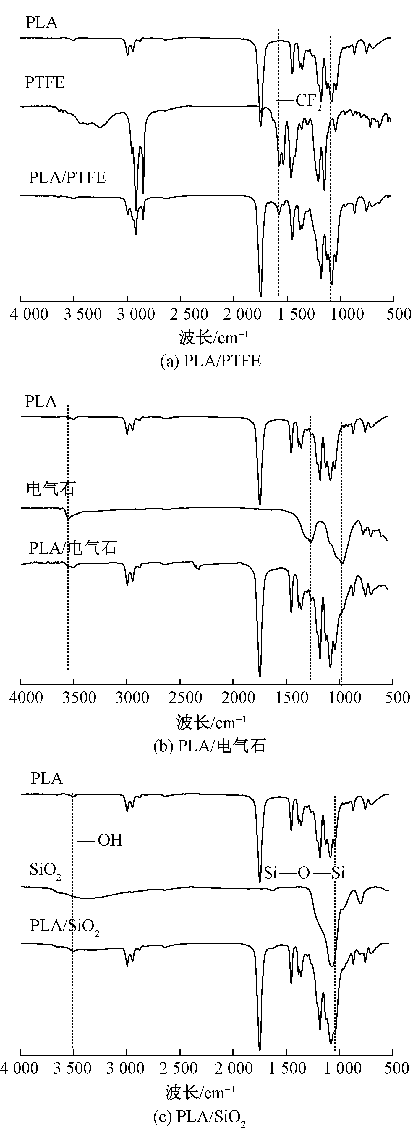 FT-IR spectra of PLA/electret membrane. (a) PLA/PTFE; (b) PLA/tourmaline;(c) PLA/nano-SiO2"