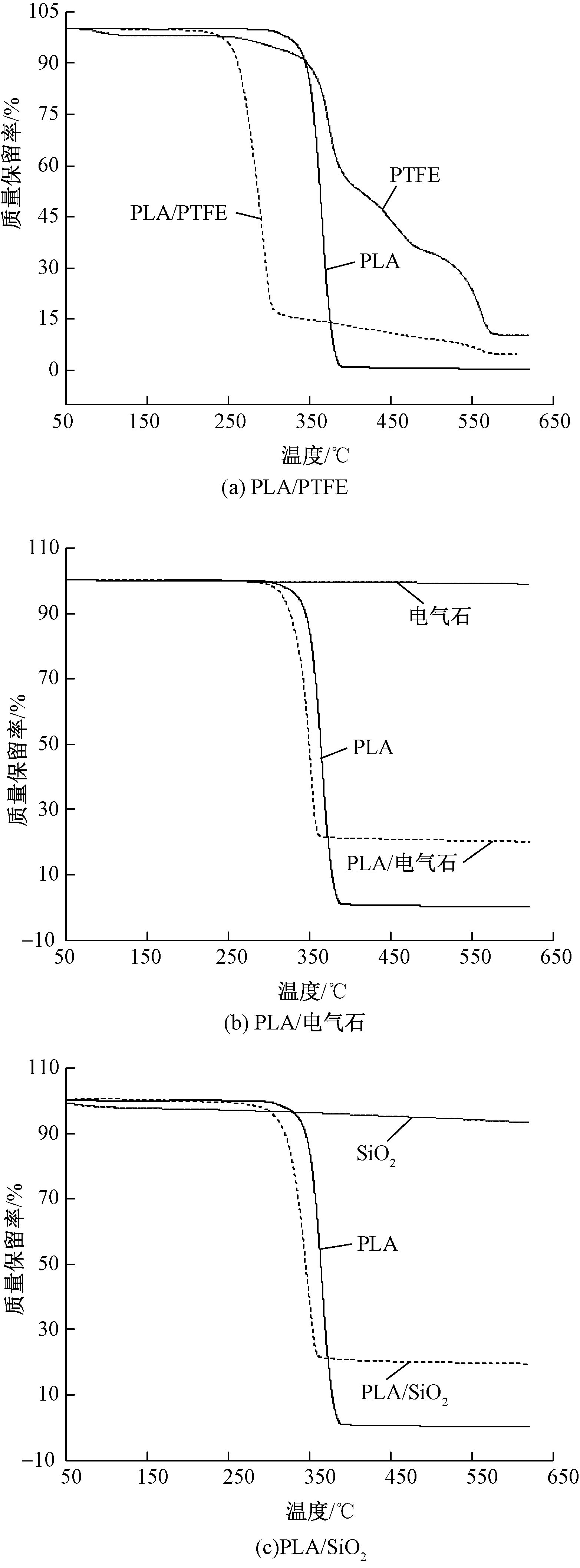 TG curves of PLA/electret membrane. (a) PLA/PTFE; (b) PLA/tourmaline;(c) PLA/Nano-SiO2"