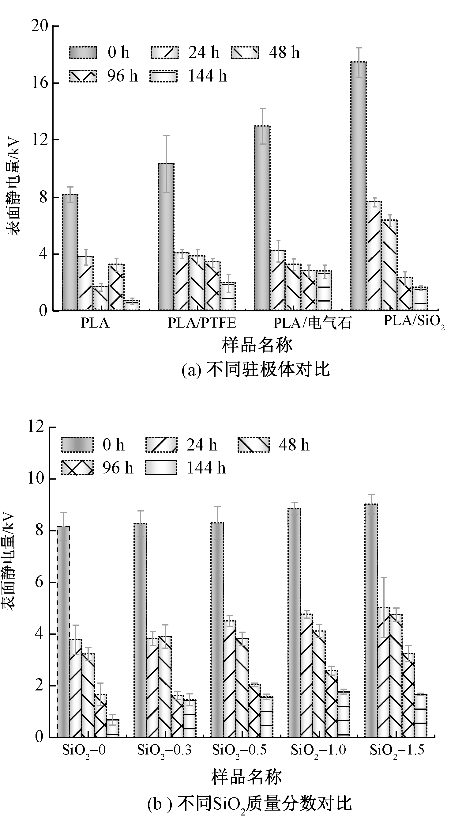 Surface electrostatic quantity of PLA/electret film sample. (a) Comparison of different electrets; (b)Comparison of different content of SiO2 electrets"