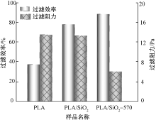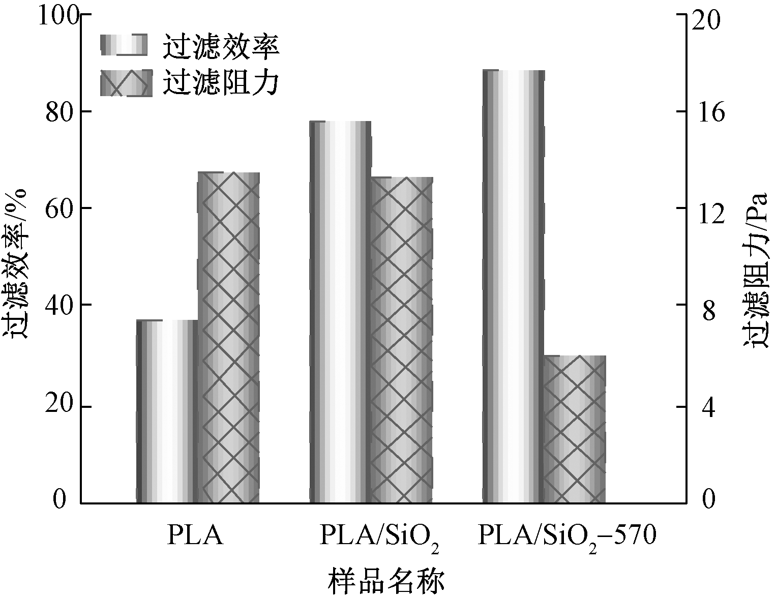 Result The PLA/electret composite membrane material was successfully prepared using the melt blending method. The PLA/SiO2 membrane material showed an increase in peak intensity at 1 109 cm-1, which is the symmetric stretching vibration peak of Si—O of SiO2, proving the successful composite(Fig.2). The starting thermal decomposition temperature of the PLA/polytetrafluoroethylene(PTFE) membrane material is reduced to around 240 ℃ and the starting thermal decomposition temperature of the PLA/ SiO2 membrane material is set at around 302 ℃, demonstrating that the addition of the electret SiO2 has little effect on the thermal stability of PLA(Fig.3). The electret significantly improves the charge storage capacity of the PLA membrane material, where the surface electrostatic charge is 8.154 kV for the pure PLA membrane material and 17.44 kV for the PLA/ SiO2 membrane material, an increment of up to 113.88%(Fig.3). The residual electrostatic charge on the surface of the PLA membrane material was 3.23 kV after 48 h, while the residual electrostatic charge on the surface of the PLA/ SiO2 membrane material was still as high as 6.34 kV. This demonstrates that the addition of a 1% mass fraction of SiO2 nanoparticles resulted in a better electret effect on the PLA membrane materials. In order to reduce the agglomeration of SiO2, the silane coupling agent KH570 was used to modify the SiO2. The modified SiO2-570 sample shows a C—H vibration peak at a wavelength of 2 930 cm-1 and a weak C=O stretching vibration peak at 1 720 cm-1, both of which are characteristic peaks of KH570 Both of them are characteristic peaks of KH570, which proves that KH570 was successfully grafted onto the SiO2 surface(Fig.5). The modified SiO2-570 nanoparticles are more uniformly dispersed in the PLA matrix, effectively reducing the agglomeration of SiO2(Fig.6). The air filtration efficiency of the PLA melt-blown nonwovens was only 37.5% at a gas flow rate of 32 L/min (Fig.8). The filtration performance of the PLA/SiO2-570 melt-blown nonwovens was superior, with a signifi-cant increase in filtration efficiency to 88.4% and a filtration resistance of only 6.2 Pa, making it more valuable for practical applications.