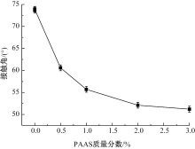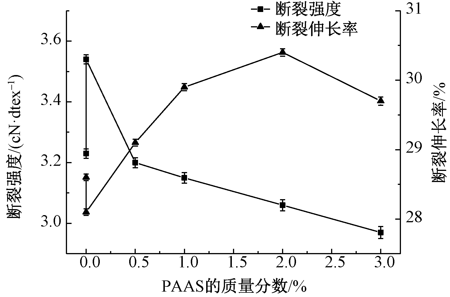 Results PAAS and nano-TiO2 were able to disperse uniformly in the polyphenylene sulfide (PPS) fiber matrix and form a good cross-compatibility (Fig.2), but when the mass fraction of PAAS exceeded 3%, agglomeration appeared and the poor dispersion led to poor spinnability of PPS composite fibers (Tab. 1). The use of Nano-TiO2 improved the crystallinity of PPS fibers, while PAAS made the glass transition temperature and crystallinity of composite fibers decrease (Fig. 3 and Tab. 2). Increasing the internal free volume and amorphous zone of fibers resulted in a slight decrease in the breaking strength of PPS fibers compared with pure PPS fibers, but the elongation at break increases (Fig. 4). When the mass fraction of PAAS was 2%, the breaking strength of PPS/PAAS/TiO2 composite fiber reached 3.06 cN/dtex and the elongation at break 30.4%, indicating the mechanical properties meeting the requirements of fabrics for apparel. The moisture absorption performance and dyeing performance of the PPS/PAAS/TiO2 composite fiber was improved, the water contact angle decreased with the increase of PAAS content from 73.7° for the pure PPS fiber to 51.2° for the PPS-5 composite fiber (Fig. 5). The standard moisture regain rate increased with the increase of PAAS content from 0.22% for the pure PPS fiber to 3.9% for the PPS-5 composite fiber (Fig. 6). Under the same dyeing conditions, the dyeing rate of PPS-4 composite fiber (90.9%) was twice as high as that of the pure PPS fiber (44.8%) (Fig. 7). The color fastness of PPS/PAAS/TiO2 composite fiber all reached levels 5 and 5 for soaping resistance (Tab. 3), and 6 and 7 for light fastness. The resistance of PPS composite fibers to light aging was significantly improved by addition of nano-TiO2, and the strength remained at more than 85% after 120 h, although there was also strength loss with time (Fig. 8).