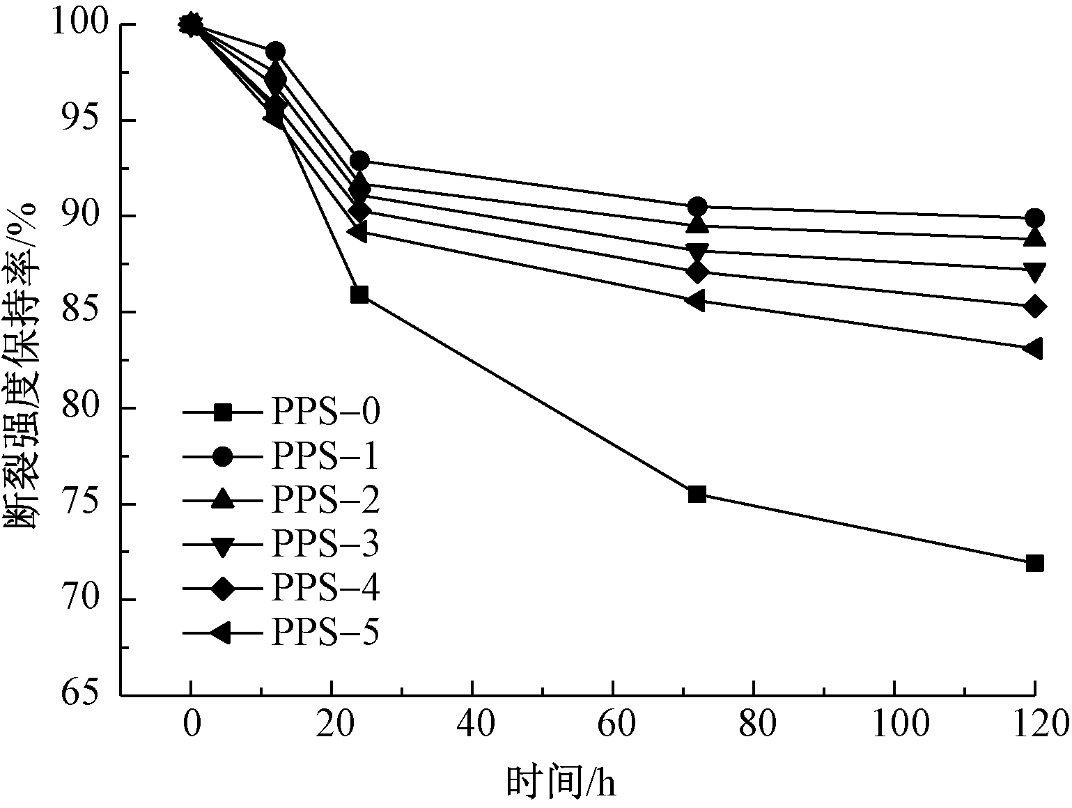 Breaking strength retention rate of PPS composite fibers after different UV aging time"