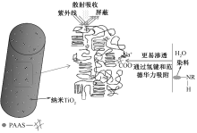 Conclusion The hygroscopic property, dyeing performance and UV resistant of PPS/PAAS/TiO2 composite fibers are all enhanced to a certain extent, partly because of the functional groups of PAAS and nano-TiO2, and partly because of the formation of a good spatial cross-linked network structure with the PPS matrix (Fig. 9). PAAS itself has a long molecular chain entanglement cross-linked structure. There are many reactive —COONa, —COOH groups inside the network, which have super hygroscopic ability. It is proved that nano TiO2 plays a role in preventing UV aging by absorbing and reflecting ultraviolet light and the scattering and shielding ultraviolet light. Water molecules and dyestuffs that penetrate and diffuse into the interior of PPS fibers produce certain hydrogen bonding with the functional groups, resulting in improved moisture regain and color fastness of the fibers. On the basis of maintaining the original properties of PPS fibers, improved moisture absorption, dyeing and UV resistant properties make it a prospective candidate fibre for apparel applications. For further development, it is necessary to focus on the deterioration of the spinnability and mechanical properties of PPS fibers that occur after the PAAS content is increased.
