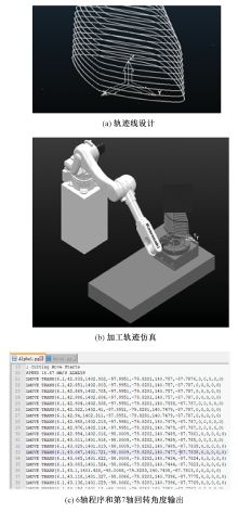 Conclusion This paper presented a 7-axis robot needling system for manufacturing composite preforms with quasi-rotary structures. The needling robot system realized the needling formation of the quasi-rotary preforms. The needling experimental trajectory of the preform parts of quasi-rotary body was highly consistent with the theoretical design trajectory, the needle trajectory was uniform, and the surface of the preform parts was flat, which proved the feasibility of the 7-axis linkage needling system. It was feasible to use Powershape and Powermill for continuous trajectory design and 6-axis robot program output, which facilitated needling trajectory planning of complex special-shaped surfaces. The self-developed algorithm of transform the 6-axis program into the 7-axis program was reliable, and the self-developed post-processing software of the executable program of the 7-axis linkage needling robot based on Python was feasible. The system could be used for high-quality needling of radome preforms and cabin preforms for high-speed aircrafts.