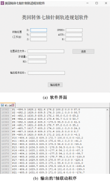 7-axis linkage needling robot program post-processing software development. (a) Software interface; (b) Output 7-axis linkage program"