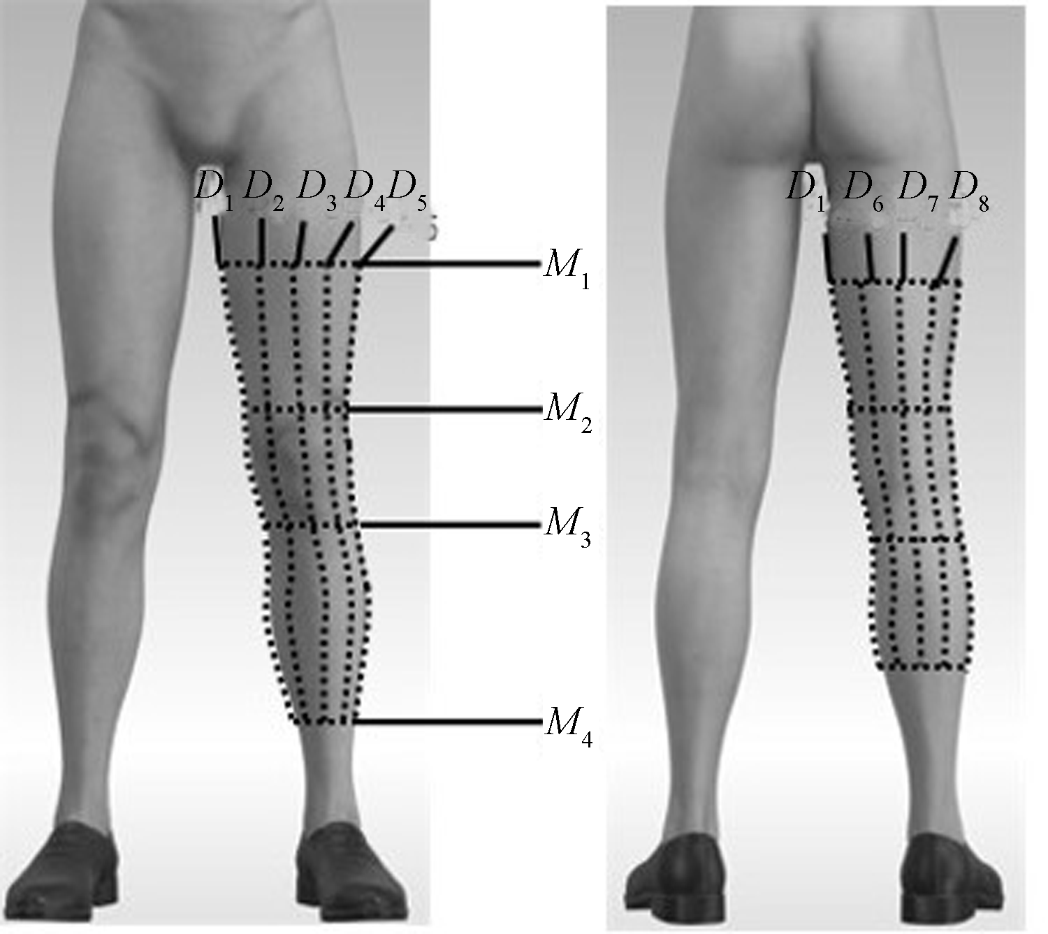 Results The leg structure was studied according to the grid line division (Fig. 1), and the leg was divided into different heat and moisture density areas by combining human body heat with moisture characteristics (Fig. 2). The prototype knee pad structure was designed according to the leg shape (Fig. 6), and the functional partitioning design was carried out through the heat and moisture characteristics to establish the functional partitioning structure of the knee pad (Fig. 7). Through the experiments related to thermal and moist comfort, it was concluded that air permeability data graph, the air permeability of the mesh structure and the set circle structure only differ by about 80 mm/s, which was 26.7% higher than the air permeability of the ribbed structure (Fig. 4). In addition, in the thermal imaging pictures, after 20 min, sweat was discharged through the coil structure, and then the air took away the moisture to achieve the cooling effect. Because of this, the overall temperature decreased fast, and the difference between the thermal imaging temperatures before and after situations was small. In the overall rating table of the moisture management test, the rib sample and the composite sample scored lower than the mesh sample by 0.75 and lower than the imitation rib sample by 0.33 (Tab. 2). The mesh sample and the loop sample scored close to each other, both of which had better moisture management performance. In the graph of temperature and humidity change, the sample knee pads reached the maximum humidity at 25 min and then dropped rapidly after 5 min, the commercial knee pads reached the maximum humidity at 21 min and then started to decrease only after 10 min (Fig. 12).
