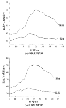 Surface temperature and humidity changes of different knee pads over time. (a) Knee pad woven with weft; (b) Commercial knit kneepad"