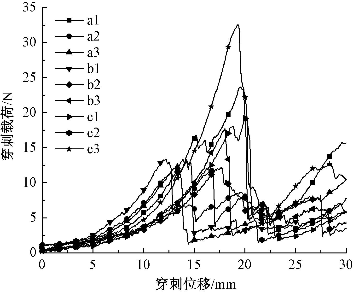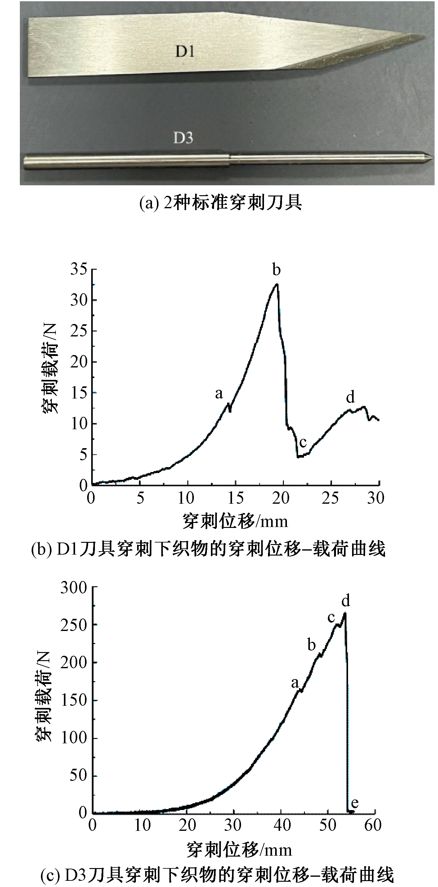 Two stab tools (a) and fabric stab displacemnt-load curves by knife D1 (b) and knife D3 (c)"