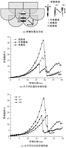 Quasi-static stab-resistance of fabric under different puncture positions and directions. (a)Stab positions and directions; (b) Stab-resistance at different positions; (c) Stab-resistance at different directions"