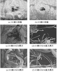 Damage morphology of fabric under quasi-static stabbing. (a) Morphology of stab opening by D1; (b) Morphology of stab opening by D3; (c) SEM image of stab opening by D1;(d) Enlarged SEM image of stab opening by D1; (e) SEM image of stab opening by D3;(f) Enlarged SEM image of stab opening by D3"