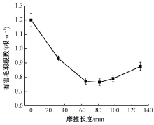 Results Based on the above device and method and under the same scraping action, the moisture regain of the yarn was controlled from 40% to 10% and the hairiness performance index was measured when adjusting the temperature of the pre-drying drum. The number of unwanted hairiness showed a trend of increasing first and decreasing afterwards (Fig. 3). The possible reason for this phenomenon was that after pre-drying, the moisture regain of sized yarn was reduced and the concentration of liquor in the yarn was increased, which improved the adhesion of the hairs to the yarn body. While after the moisture regain of sized yarn was reduced to a certain level, the yarn and the hairs was drying out thus the adhesion of them was reduced, more hairs could not be adhered to the yarn surface. It showed that 20% moisture regain of sized yarn was more beneficial in reducing harmful hairiness in the proposed system. The friction length was a comprehensive representation of the operating parameters of the hairiness attaching device, and it was used as a control variable influencing the hairiness reduction effect. When the moisture regain of sized yarn was set as 20% as optimized above, and the friction length was controlled to vary the extent of the applied scraping action. As the friction length increased the scraping action increases and the number of harmful hairiness showed a decrease followed by an increase (Fig. 4). The possible reasons were considered as follows. Firstly, a higher friction length indicated a longer actuation duration of the adhesion effect leading to more hairs being adhered, which would approach a maximum as the friction length increases, while a higher friction length also indicated a higher possibility of adhered hairs to be scraped from the yarn surface. Under the combined effect of them, the unwanted hairiness decreased as the friction length increased at first and increases after the friction length reached a certain point. Finally, under the experimental conditions of this research, when the proposed hairiness attaching device was established and applied, a friction length controlled around 81.6 mm would be more beneficial to the harmful hairiness reduction.